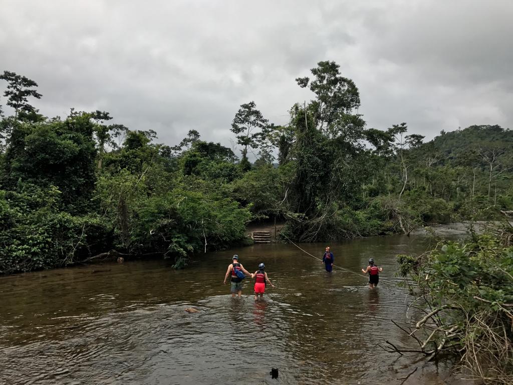 A bus ride from San Ignacio is provided and took about an hour. The tour starts with a walk to the cave. Ideally there are three river crossings. Above shows the first crossing, which is the deepest, but has a rope across to hold if you are uncomfortable. Going in it was no problem. The other two crossings were mild. One was only just above ankle deep.