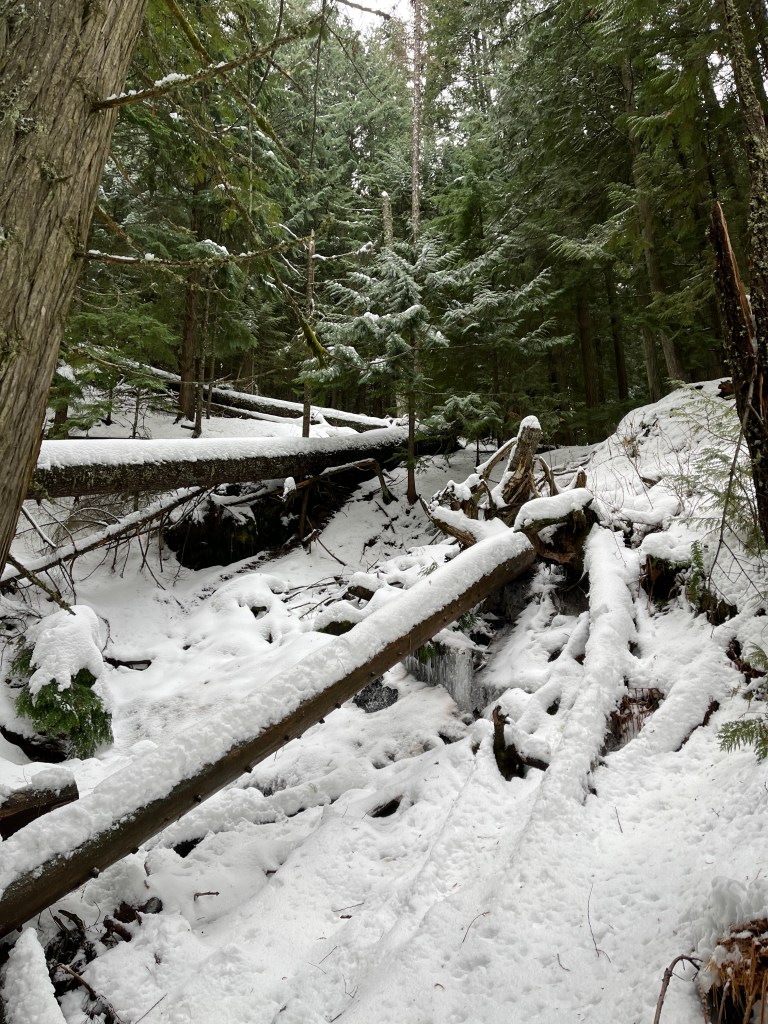 Once past the switchbacks it’s a gentle grade up to the waterfall. You’ll know you’ve arrived, there’s a bridge crossing the water. I did warn that the falls are not very inspiring. In summer they are minimal. In the depths of winter it’s a cascading carpet of ice climbing the hillside. I’ve never gotten a decent photo. There’s trees, fallen logs and forest debris in the way, dang trees.