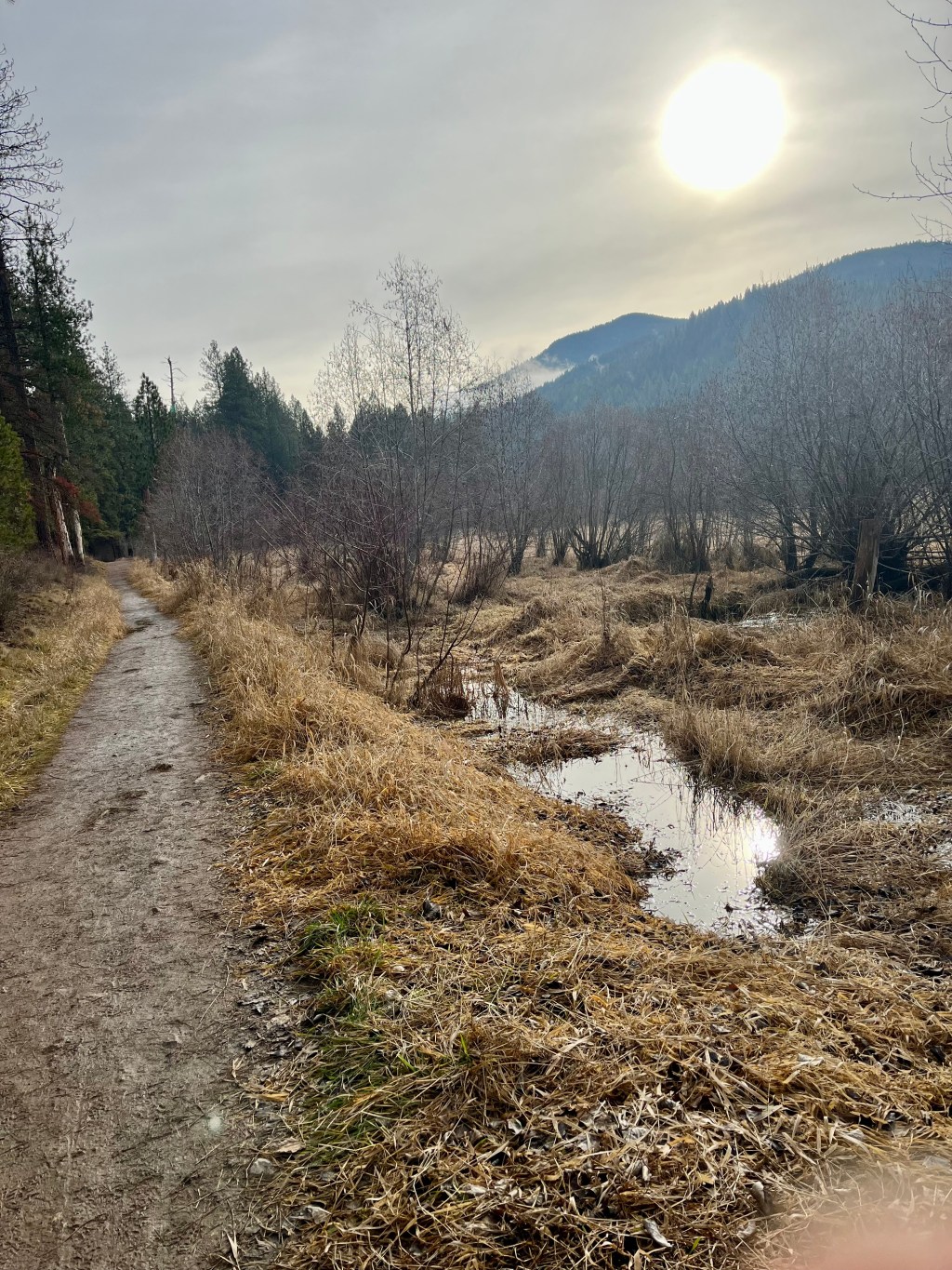 There’s a bridge crossing the creek where you immediately begin your ascent up a few switchbacks. These switchbacks are notoriously ice laden slippery slopes in winter and this day was no exception. At this point I was glad to slip on a pair of ice cleats over my boots. Hooray for walking forward without sliding back or falling. As my surgeon mentioned, no falling is preferred for the recovery of my hip. And just in general, falling is to be avoided. All my medical professional friends would agree.