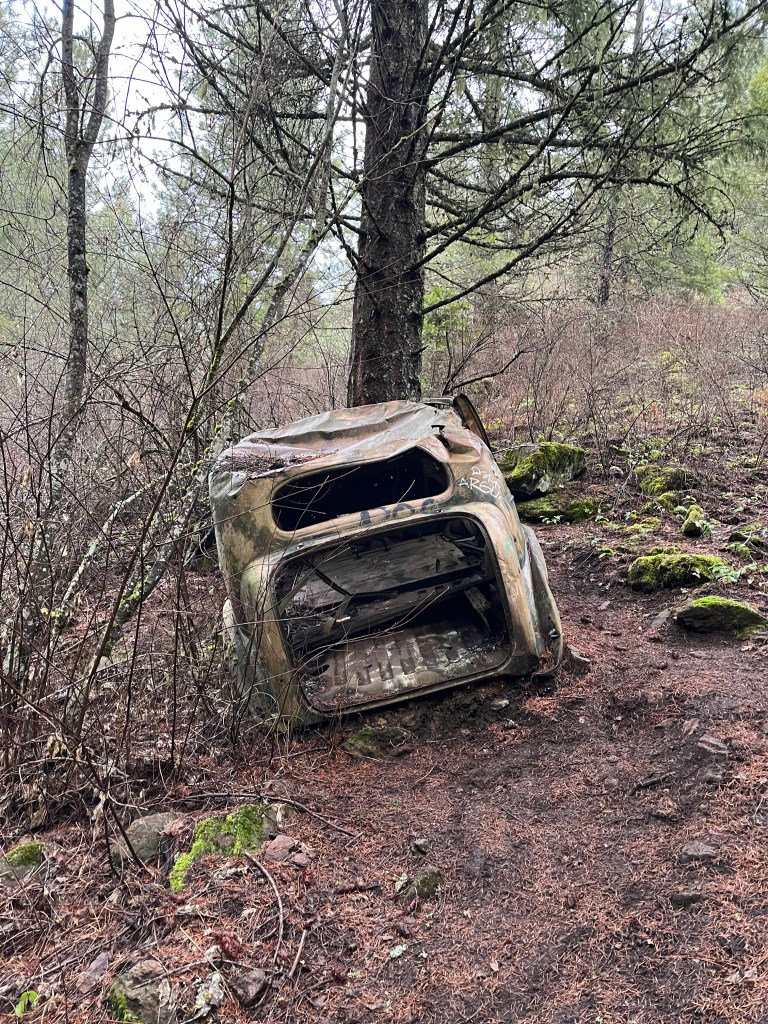 Entering into the woods the trail splits and is clearly marked. For the “waterfall” it’s dead ahead. This lower section is relatively flat and an easy stroll. There is another split in the trail ahead, it doesn’t matter which you choose. They connect again shortly, the split takes you on either side of Liberty Creek. The path on the left will take you past an old abandoned vehicle. There are a lot of these in the area and they are made into “features” on hikes. Keep heading forward and you’ll enter a Cedar Grove. This is a lovely spot to stop for a rest, or in my particular case, let Lucille out to explore.