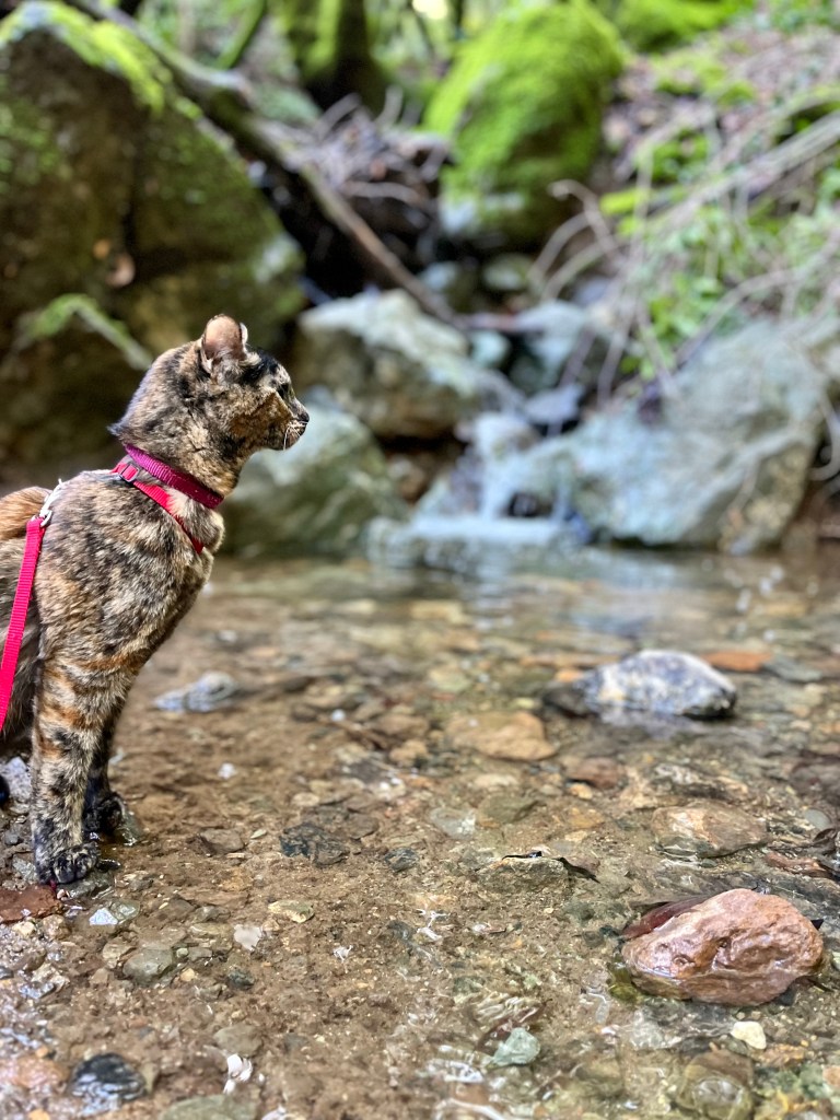 Lucille was in better spirits today and was willing to walk for brief intervals. She got to experience her first miniature “waterfall” and meet fellow hikers. Once turned onto Prospect trail, there’s a pretty sandwich spot with a picnic table and lovely overlook. We thoroughly explored the bushes here. Apparently the sniffs were marvelous. Leaving this idyllic spot a flock of little birds captured Lucilles attention as they flit from branch to branch. It took some coaxing to convince her to continue on.