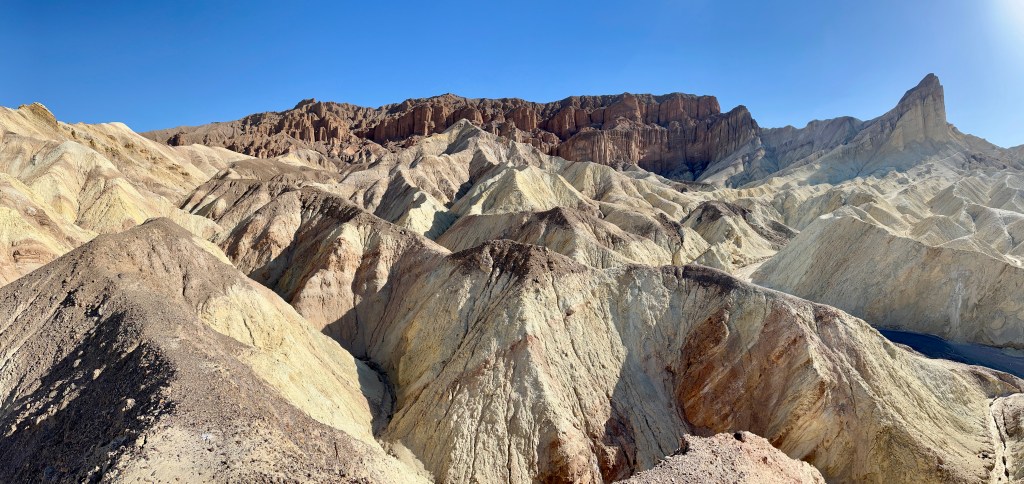 After this point the trail winds up over and around the badlands, a lot of brown and gold hills, getting ever closer to Zabriskie, which is visible in the distance. There is a connector trail leading straight to Gower Gulch if one wishes to bypass Zabriskie or simply shorten your mileage. We forged ahead instead. The last portion up to Zabriskie has you turn into a small wash and pops you out near the parking lot and happily, the bathrooms. It’s a short walk up the paved hill to the actual point.