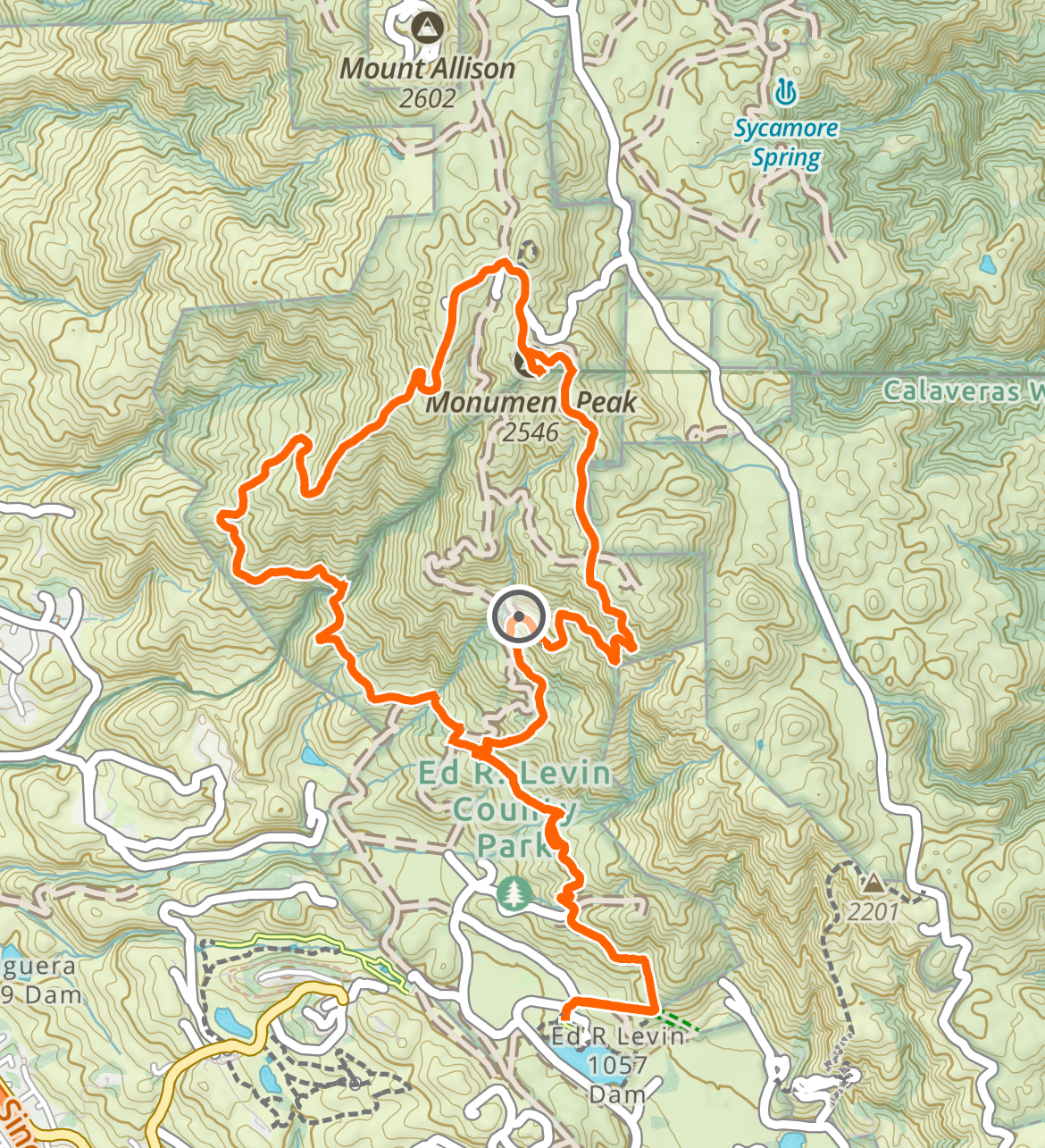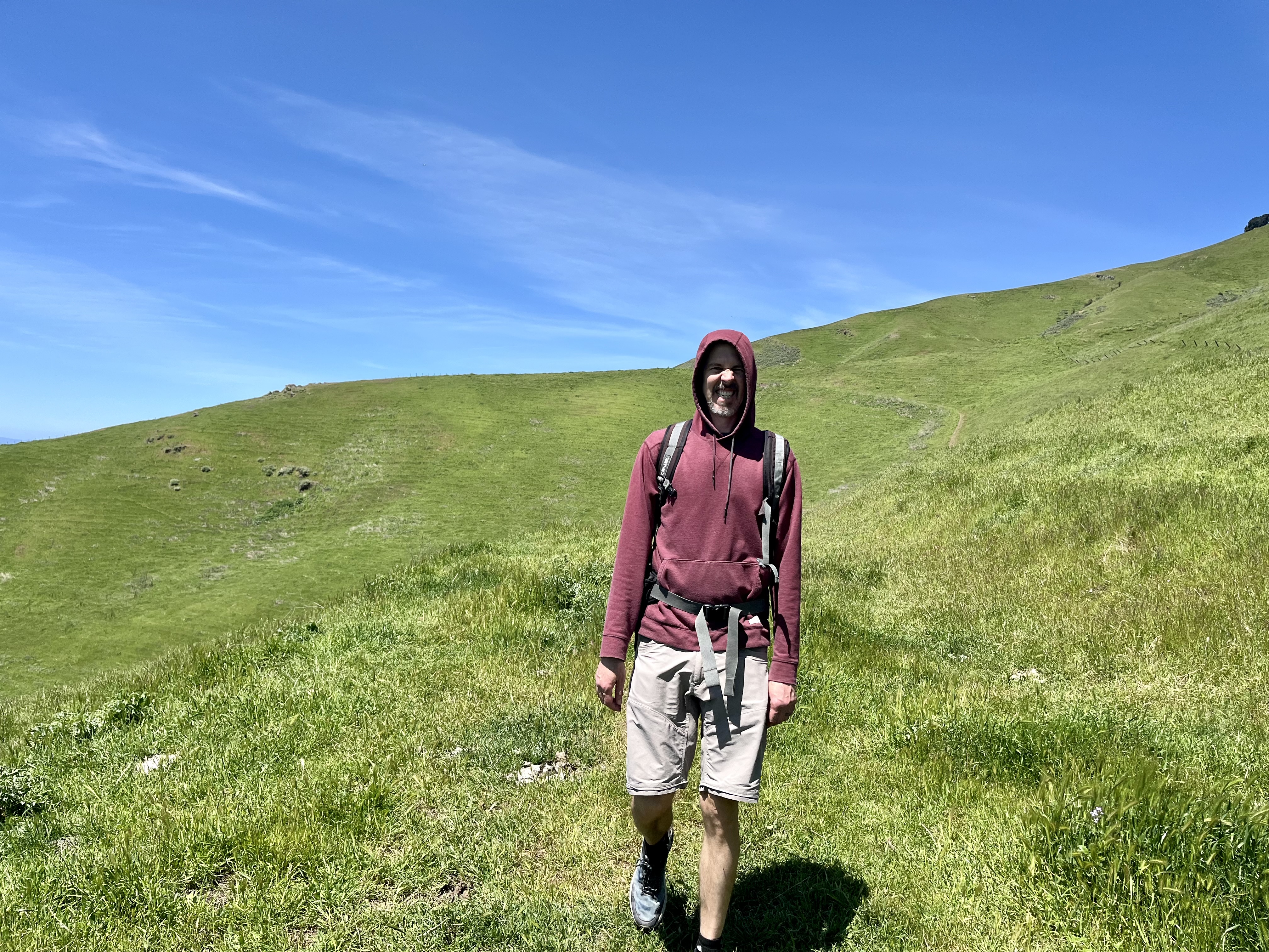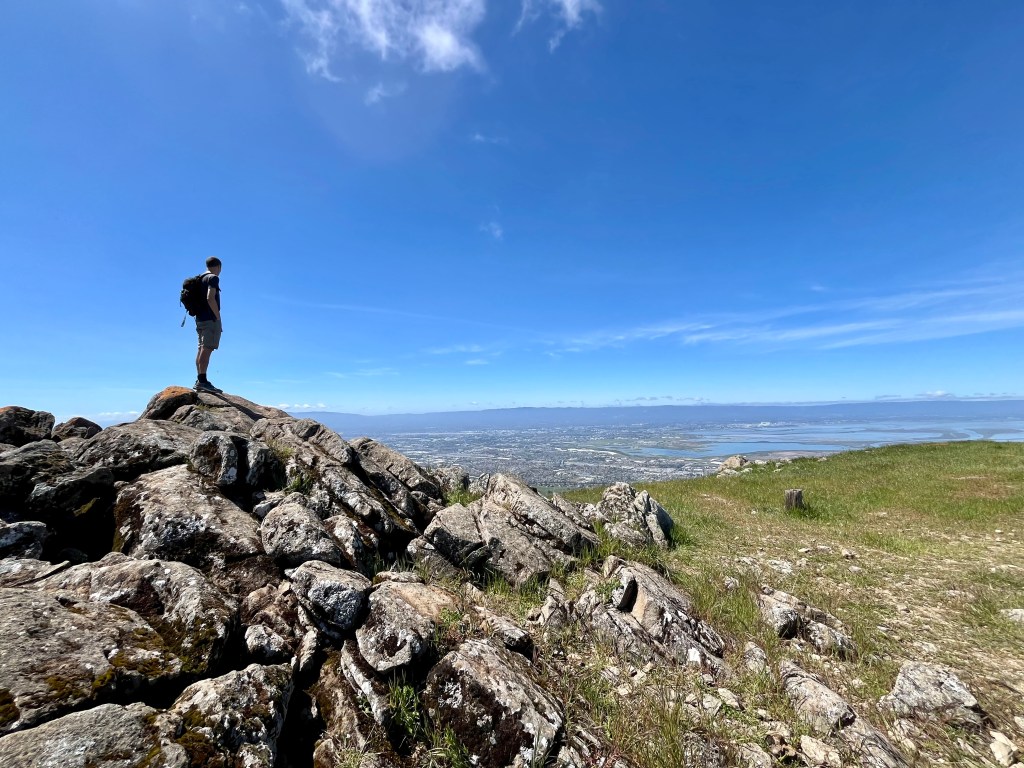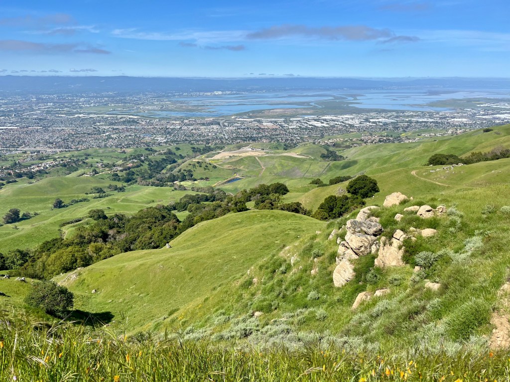 The peak itself encompasses a pile of rocks atop a hill. Makes for a nice photo. Views naturally include San Francisco Bay, the sea of civilization surrounding the bay, including San Francisco in the distance. Looking out over the backside of Monument Peak the Calaveras Reservoir is visible amongst the surrounding hills. Being early spring, everything was lush and green.