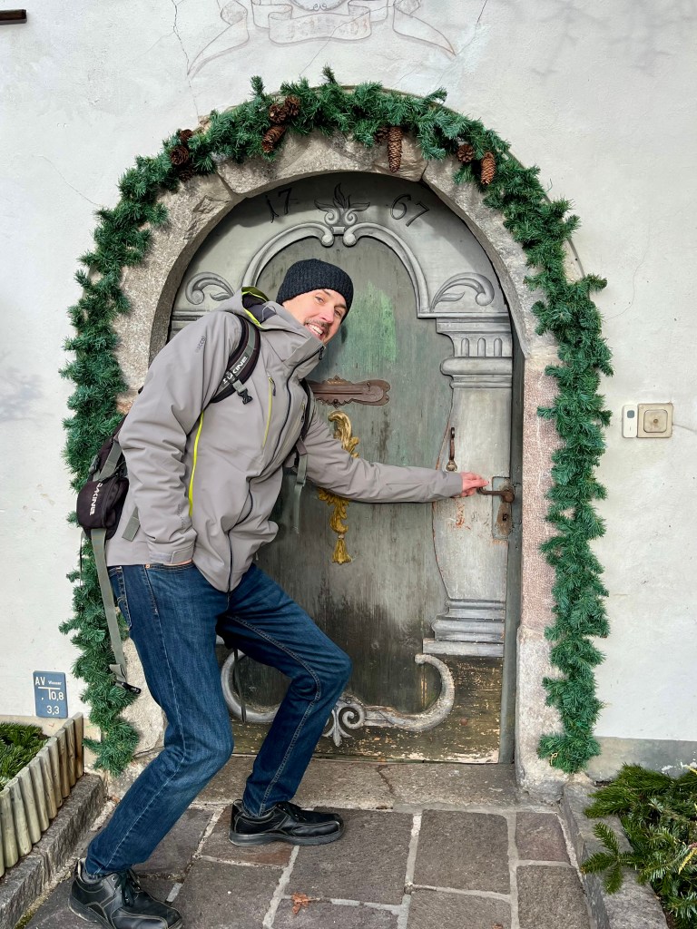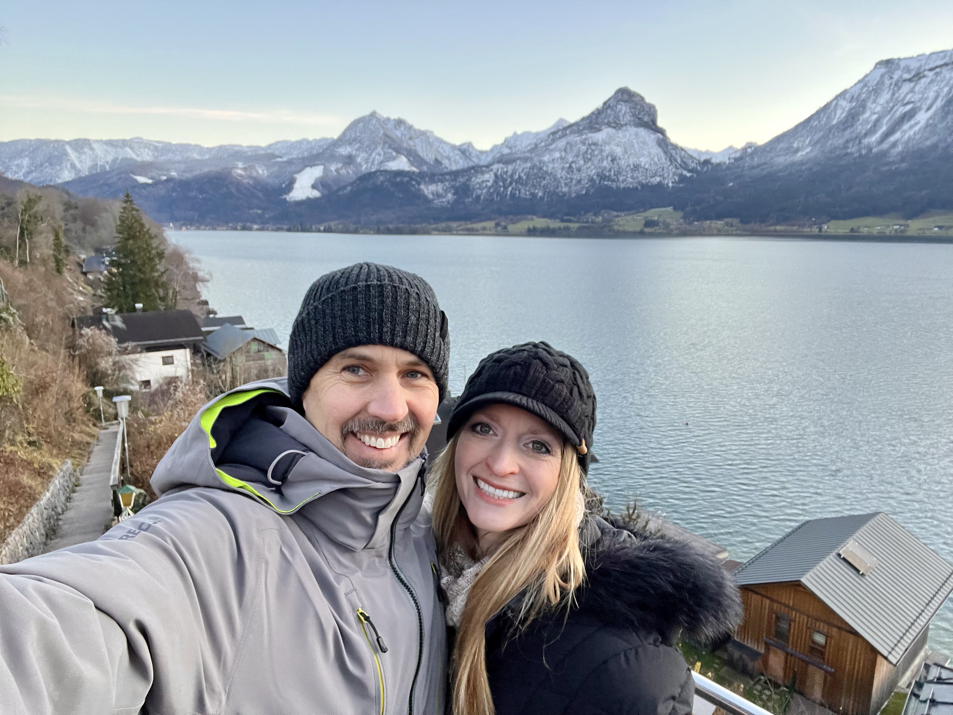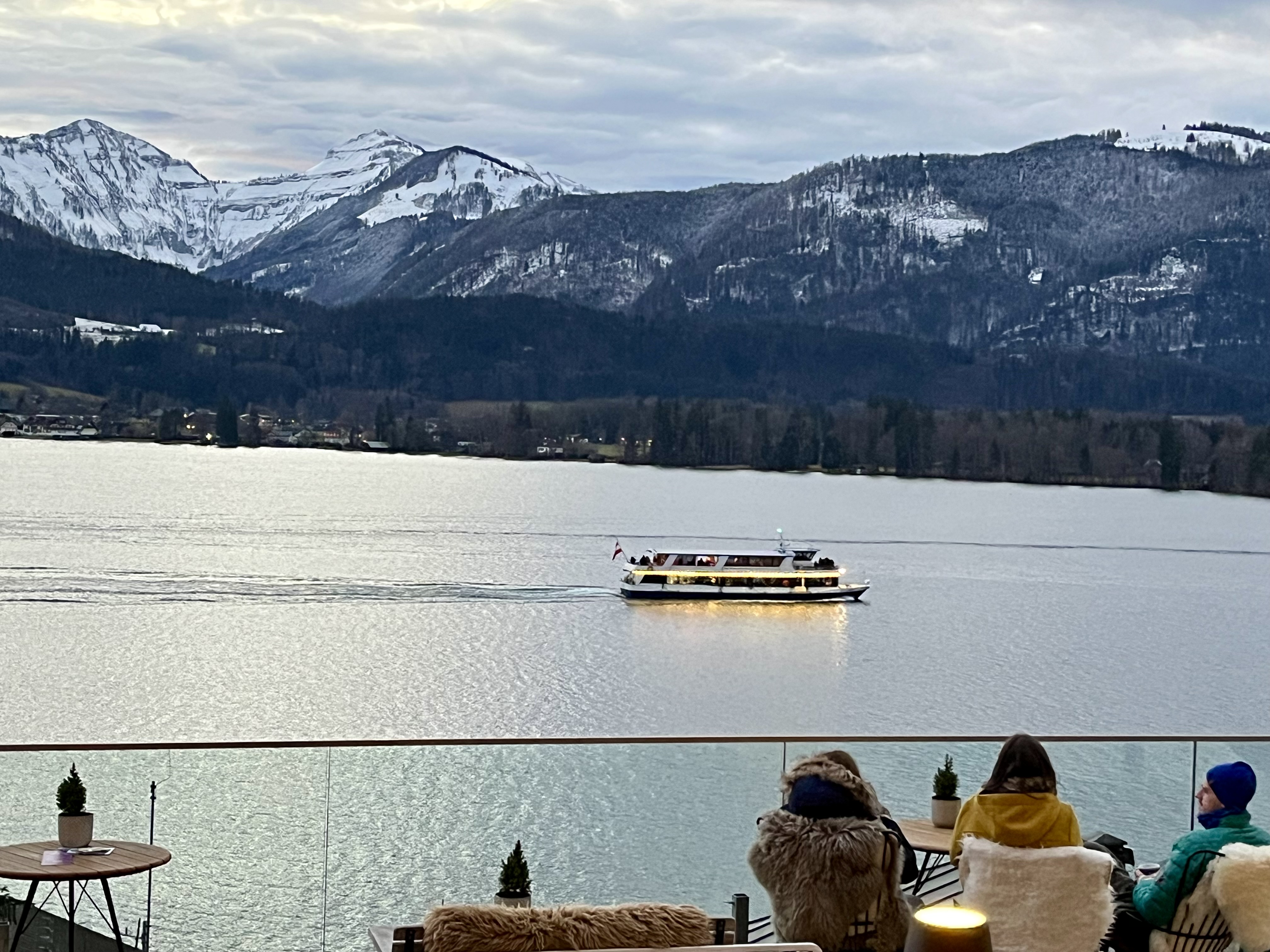 Returning toward the main streets we made a pit stop at a Paul Der Wirt for a beverage on the patio. I chose a lemony hot toddy type drink (not good) and Doug chose a part gin apple cider type thing (much better). I’m thinking I don’t prefer Austrian hot drinks. All that aside, the setting is gorgeous! We chose seats against the building instead of on the lovely terrace. The terrace looked more inviting but DANG I was sick of being COLD! So warmer seats were selected. Still a perfect place to watch the “sun” go down behind all the clouds and darkness overtake the sky. Fabulous views of the church downtown and the lake.