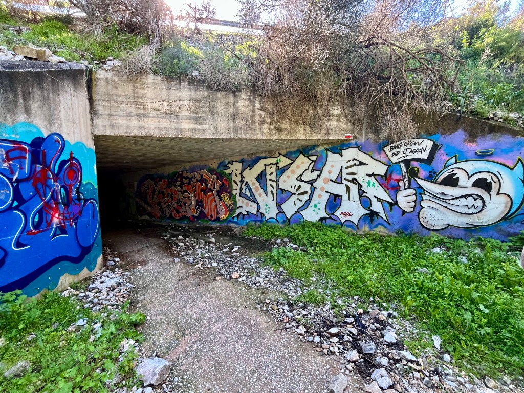 From here, immediately head to the grossest part of the hike. The tunnel under the freeway. A gated set of stairs takes you into what looks more like an oversized excess water drain than a pedestrian passage. There’s plenty of trash and graffiti. And as it had been raining, a constant stream of unpleasant drips from above. Eww. I made it through without getting dripped on. Not so much on our return.