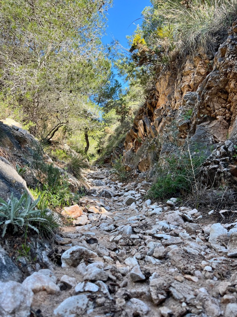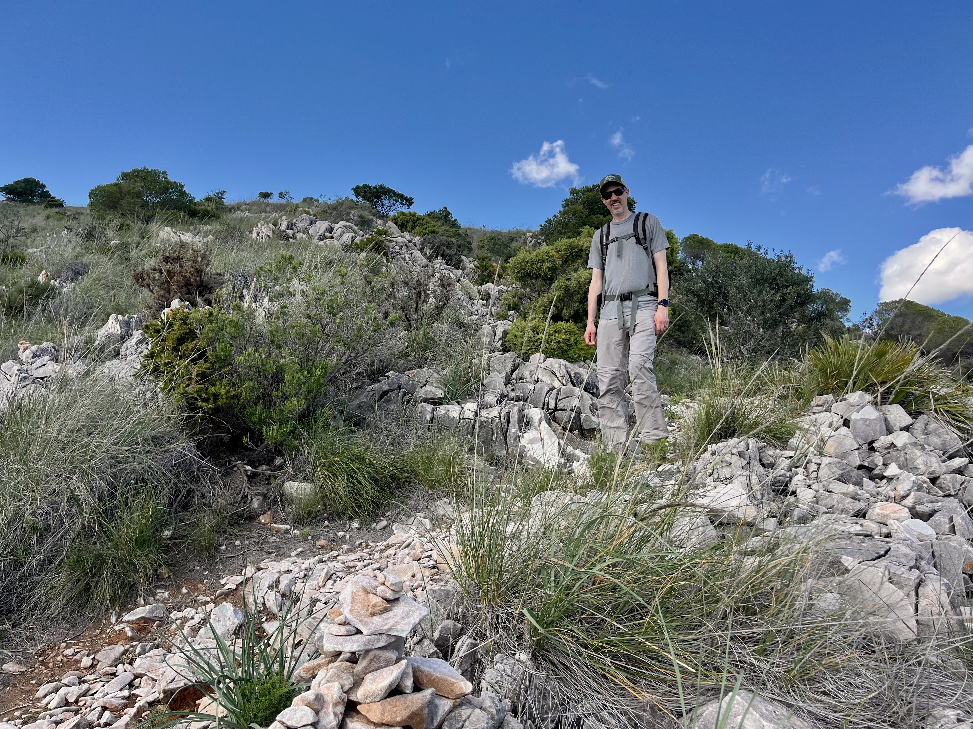 Upon exiting the tunnel, you’ll be faced with a decision. Head right at the split onto trail GR 249 (I believe) or head straight up the gulley on PR-A 57. We chose straight up the draw. The trail is relatively easy to follow and frequently marked with posts, complete with color coded bands painted on them. The band color correlates to your chosen route. Makes things fairly easy to navigate.