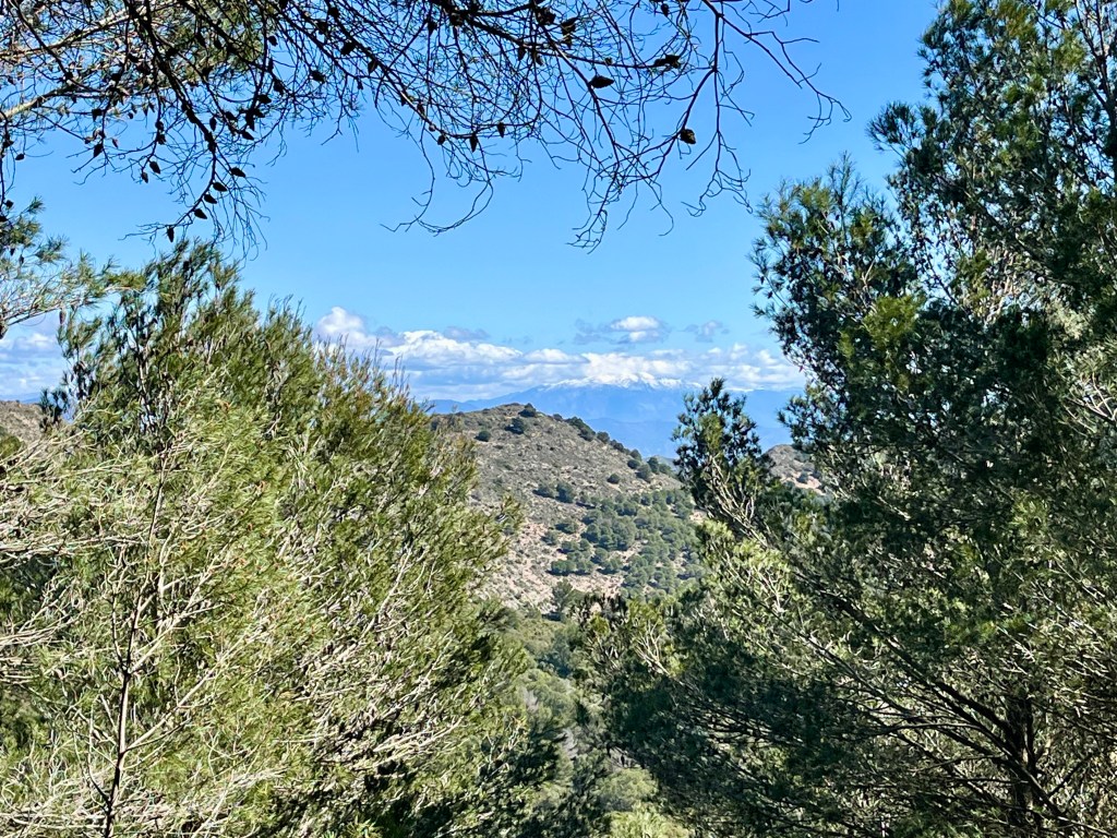 We simply desired a nice lunch spot. There’s series of dug out stairs and wood railings near the top. And a little covered patio. Views are 360 degrees. Pick what you like best. Our only surprise was the extensive quarry nestled between two mountains marring the hillsides. Other than that, the views were stupendous. The Costa Del Sol, the Sierra Nevada’s snow capped peaks visible to the East, the Sierra de las Nieves to the distant West. Looking inland, many small towns dotted the hillsides. We chose rocky seats facing the white painted town of Mijas. You could see Gibraltar in the hazy distance. Great place to inhale a tuna sandwich. Turns out we were hungry.