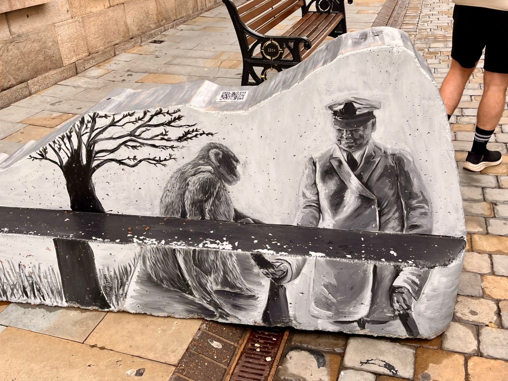Walking through town along the main strip, aptly named Main Street, there are a plethora of shops and restaurants. Along the way there are quite a few Rock of Gibraltar shaped “rocks” painted with black and white scenes. They are pretty interesting.