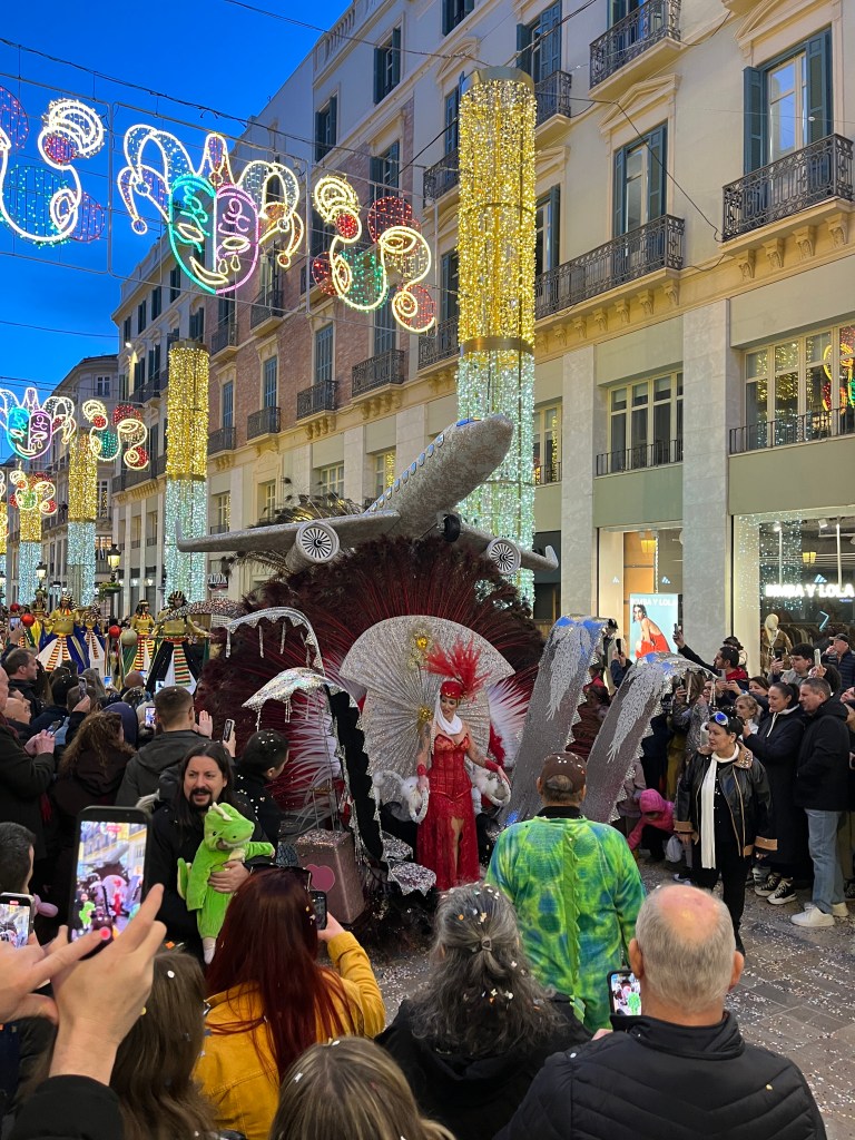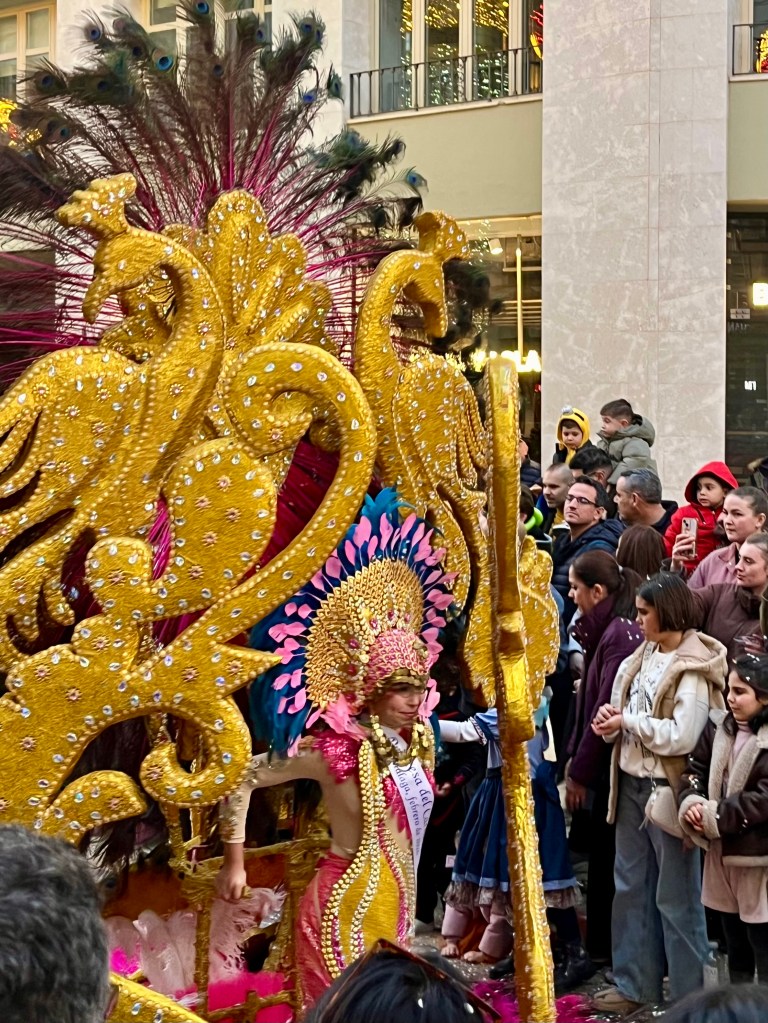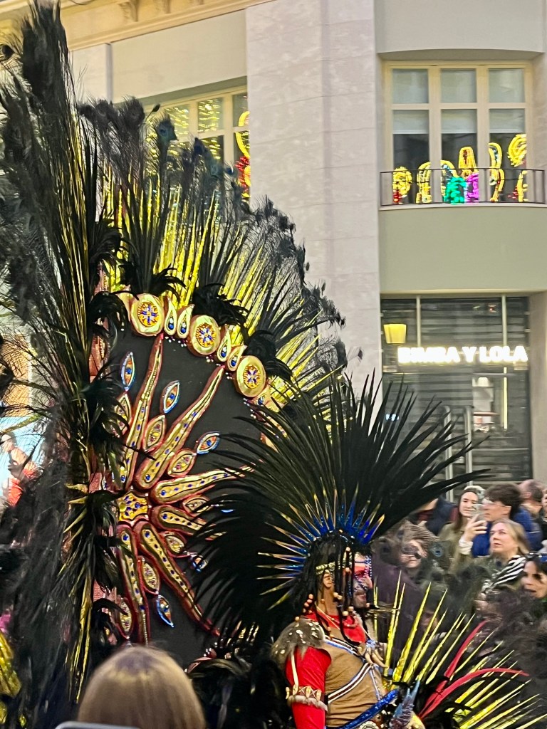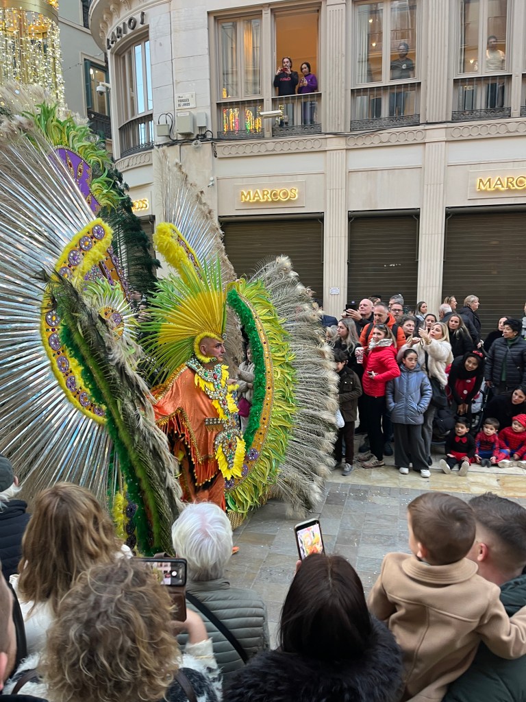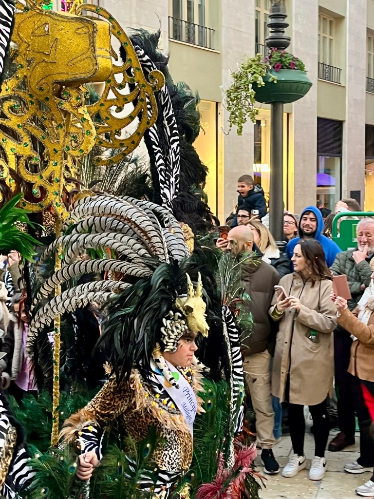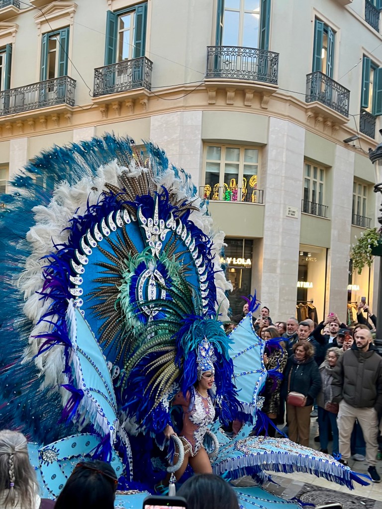 As Malaga is a few train stops away, we chose to head into the city to join the festivities. Malaga’s Carnaval seems to last around 10 days or up to two weeks. There are daily events. In theory, the Carnaval begins with a speech from a prominent person in the community and the “Gods and Goddesses” are introduced. These are persons in remarkably elaborate costumes. Think sequins and feathers. But big. This year, the weather was so bad (epic storms and rain) I heard the opening ceremonies are being held later in the week.