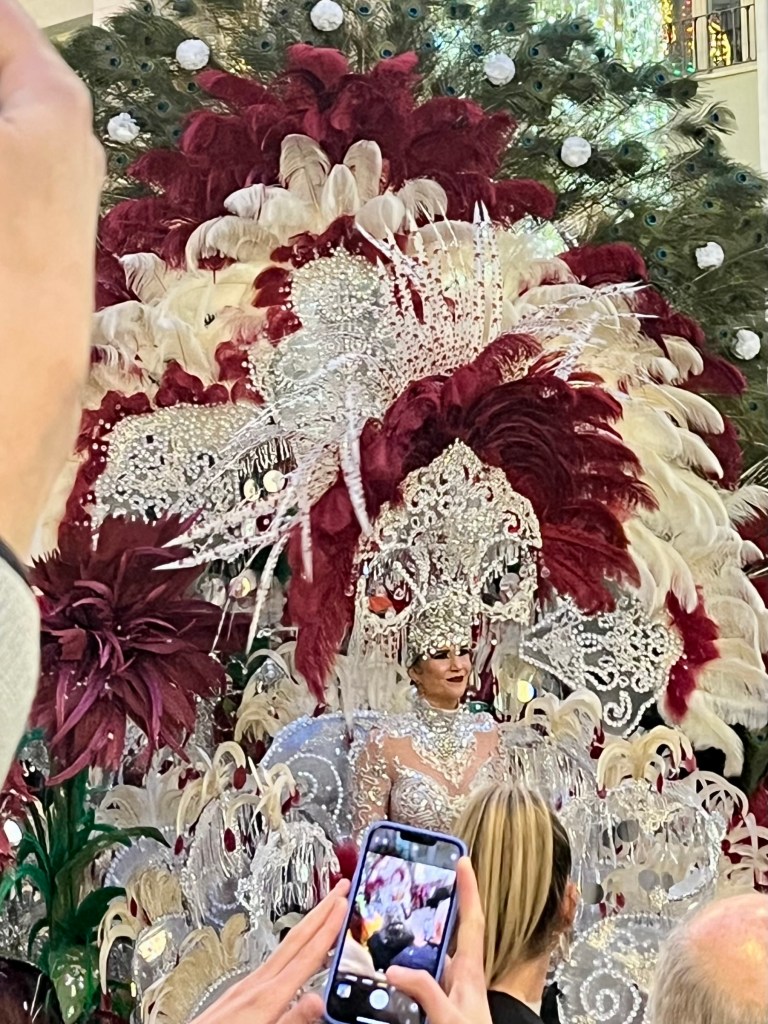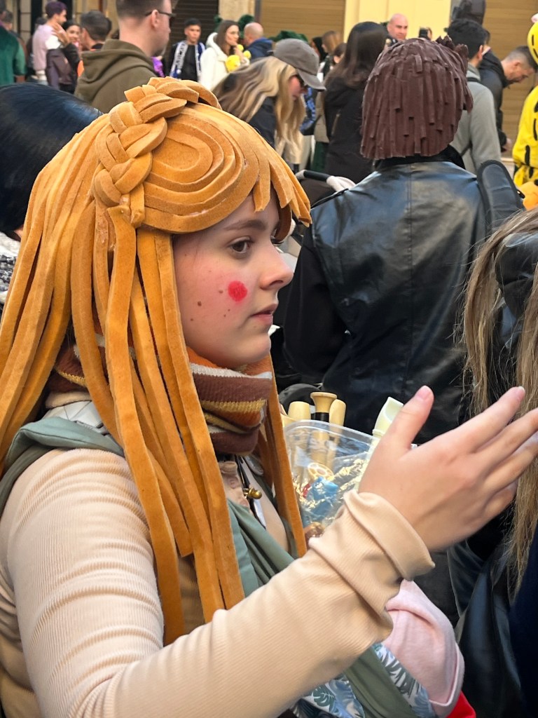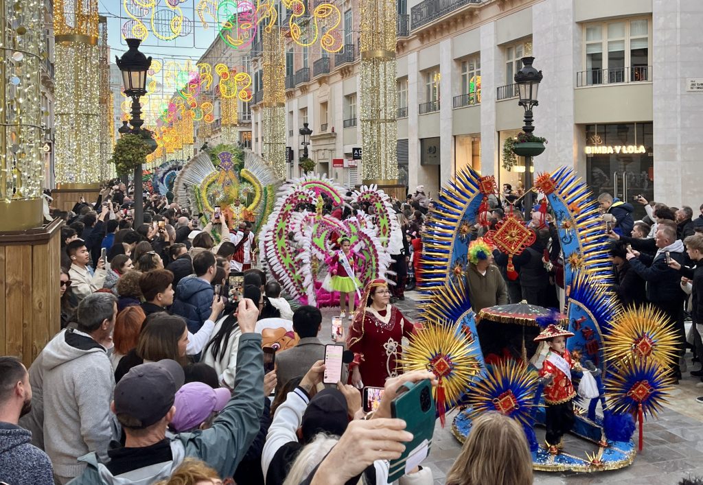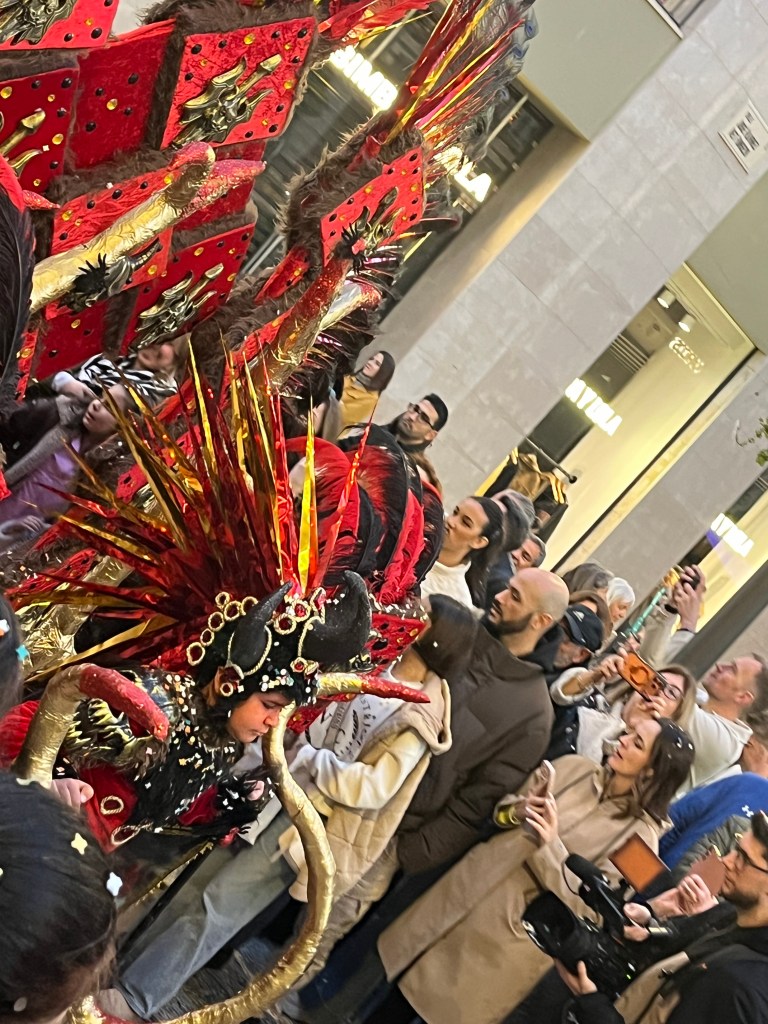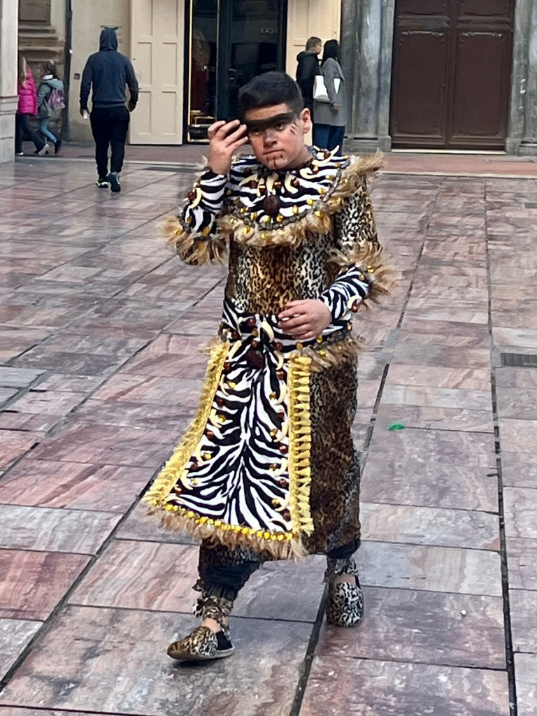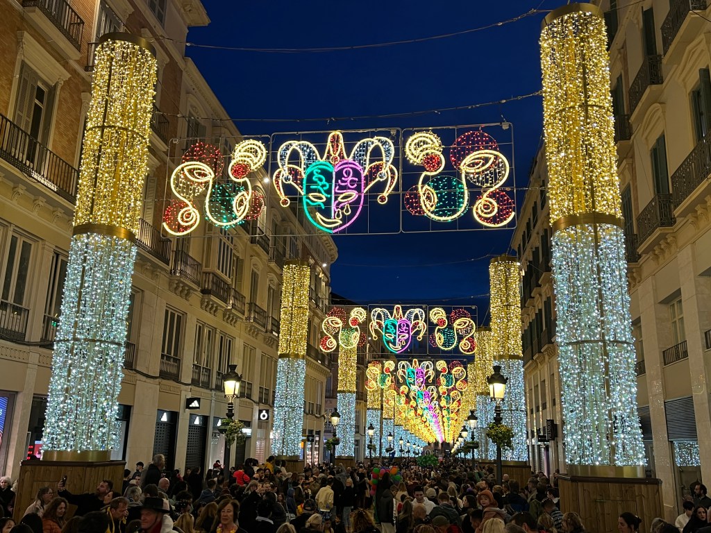 As Malaga is a few train stops away, we chose to head into the city to join the festivities. Malaga’s Carnaval seems to last around 10 days or up to two weeks. There are daily events. In theory, the Carnaval begins with a speech from a prominent person in the community and the “Gods and Goddesses” are introduced. These are persons in remarkably elaborate costumes. Think sequins and feathers. But big. This year, the weather was so bad (epic storms and rain) I heard the opening ceremonies are being held later in the week.