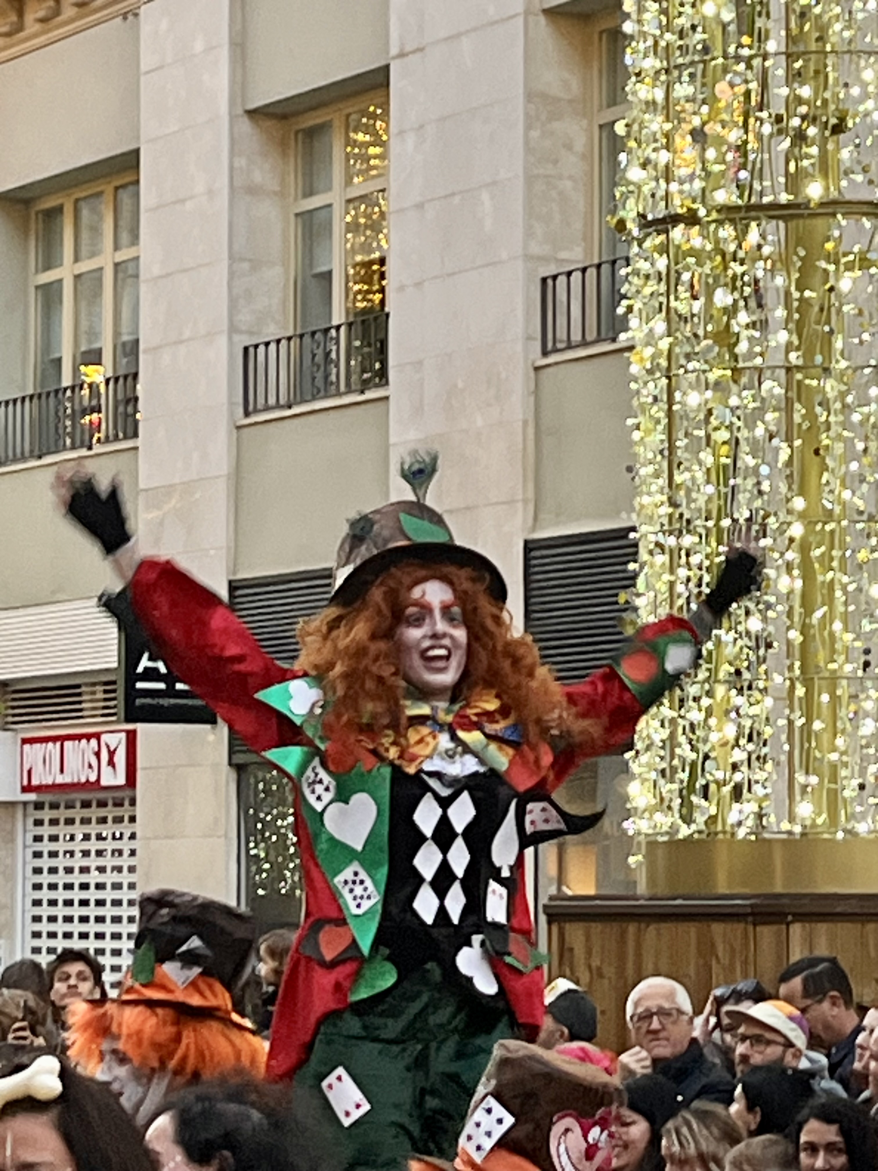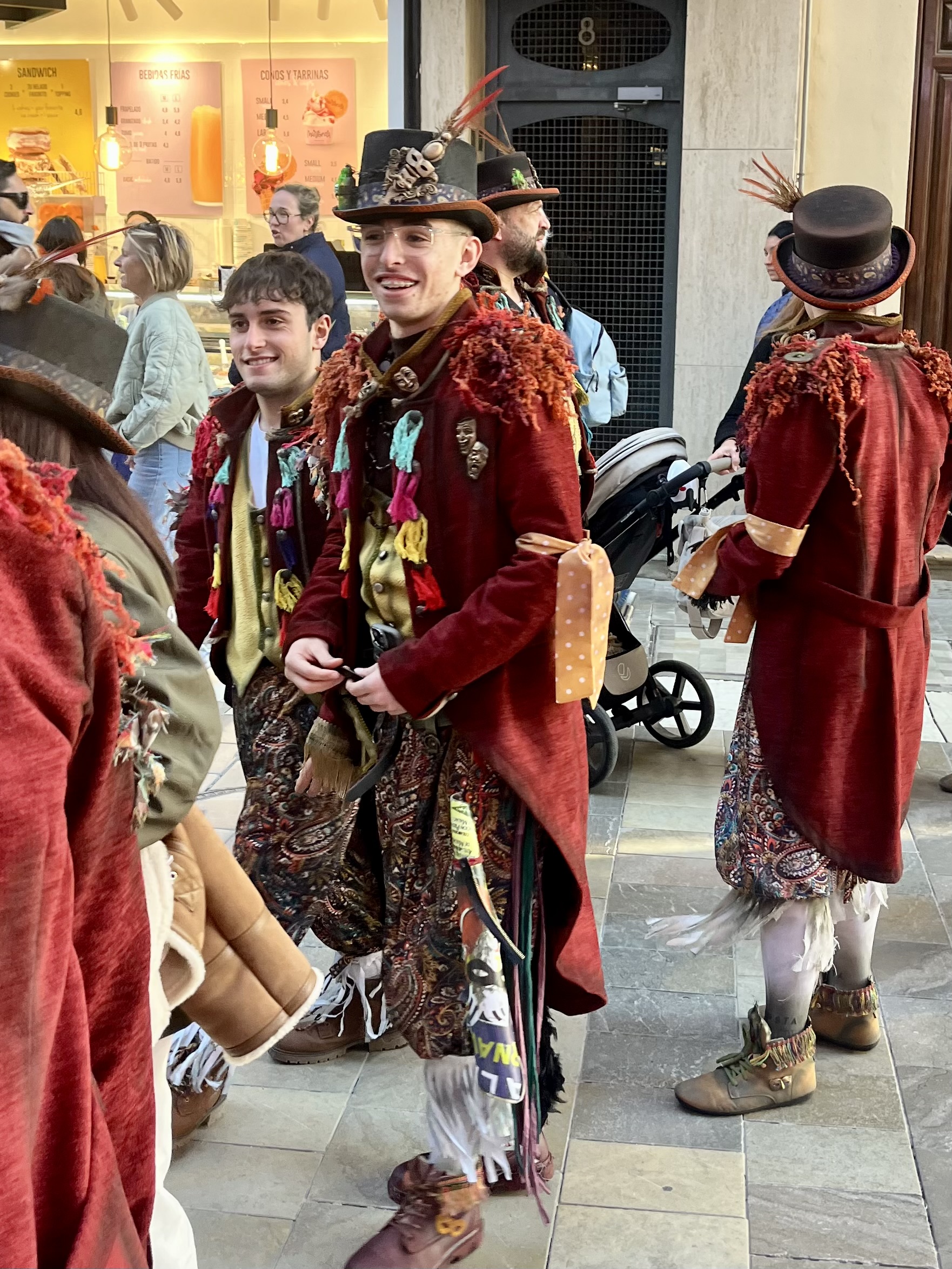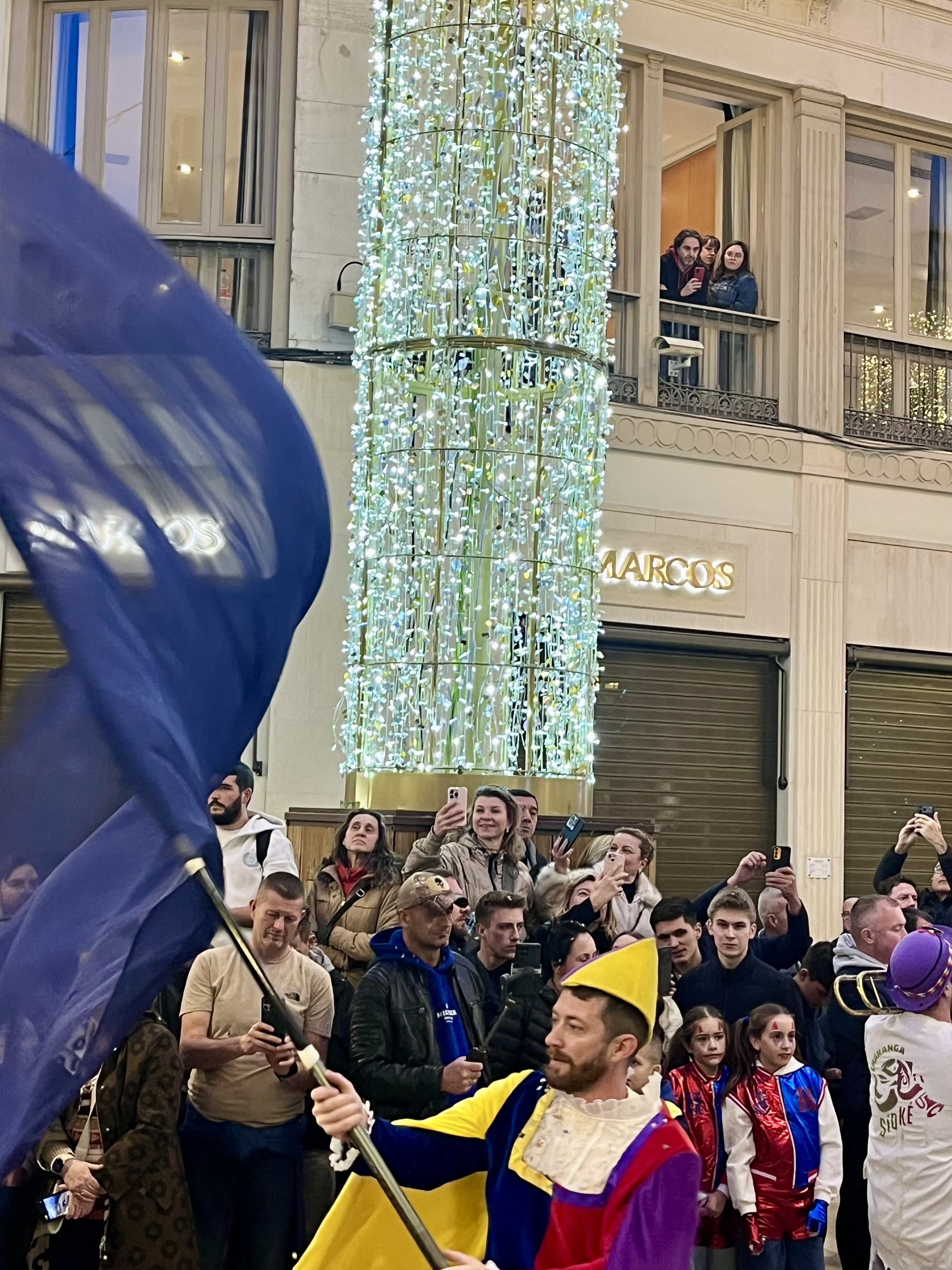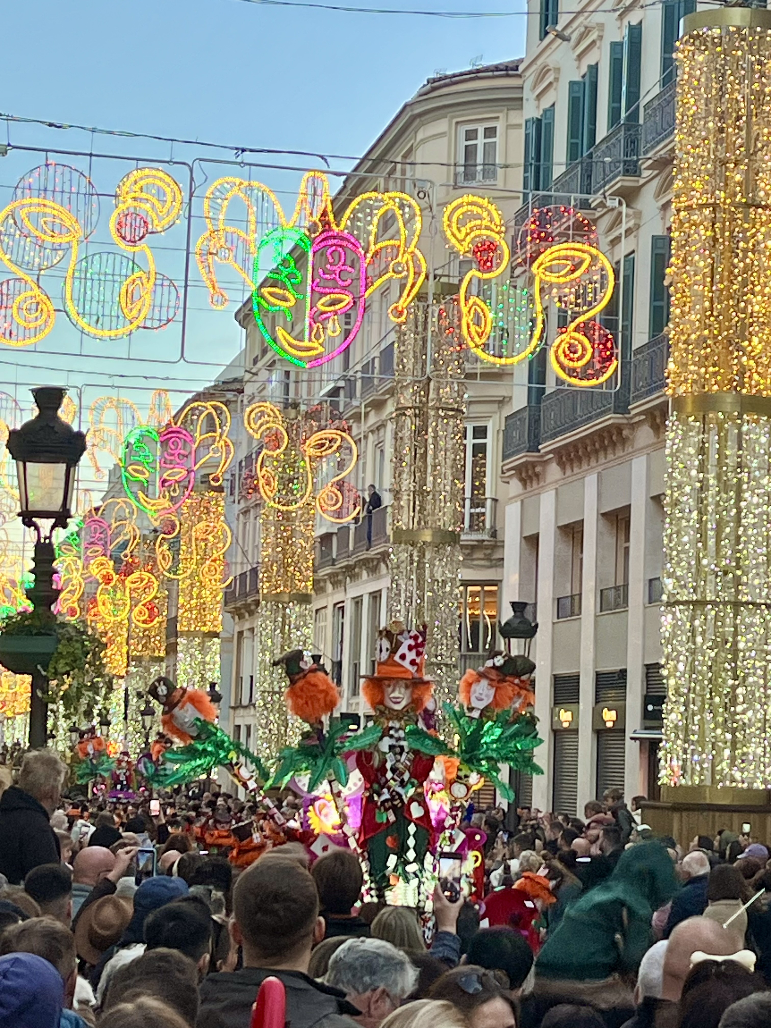 We happily joined another couple and headed into town. Some things are better with friends! Festivities were supposed to start at 1300. Being Spain, we purposely showed up well after that. I’d say the streets were decorated beautifully. The main drag boasted pillars lit up in twinkling lights with banners across the streets that reminded me of Mardi Gras decor. These banners had similar colors of gold, green and purple with a joker type character on each one.