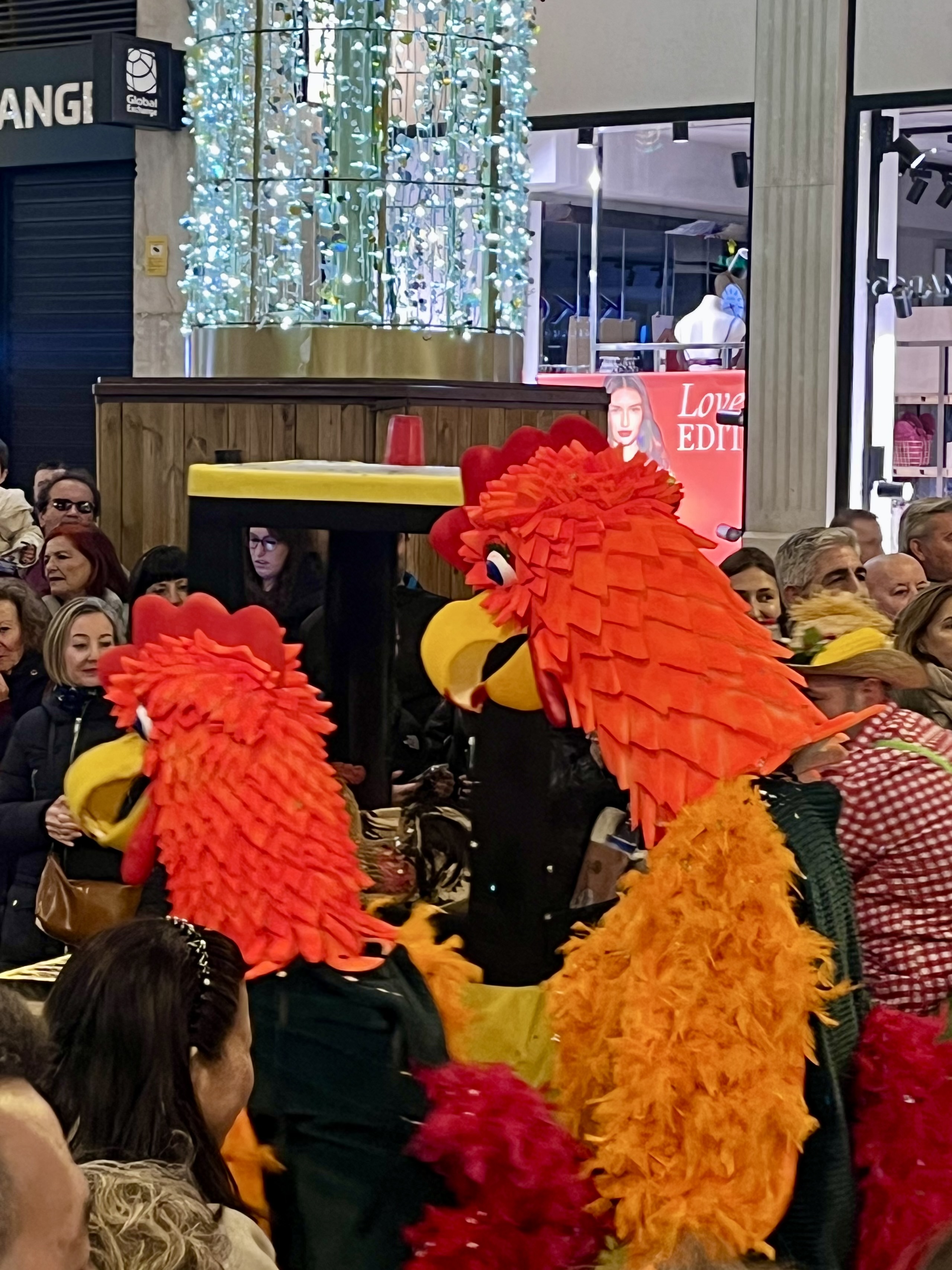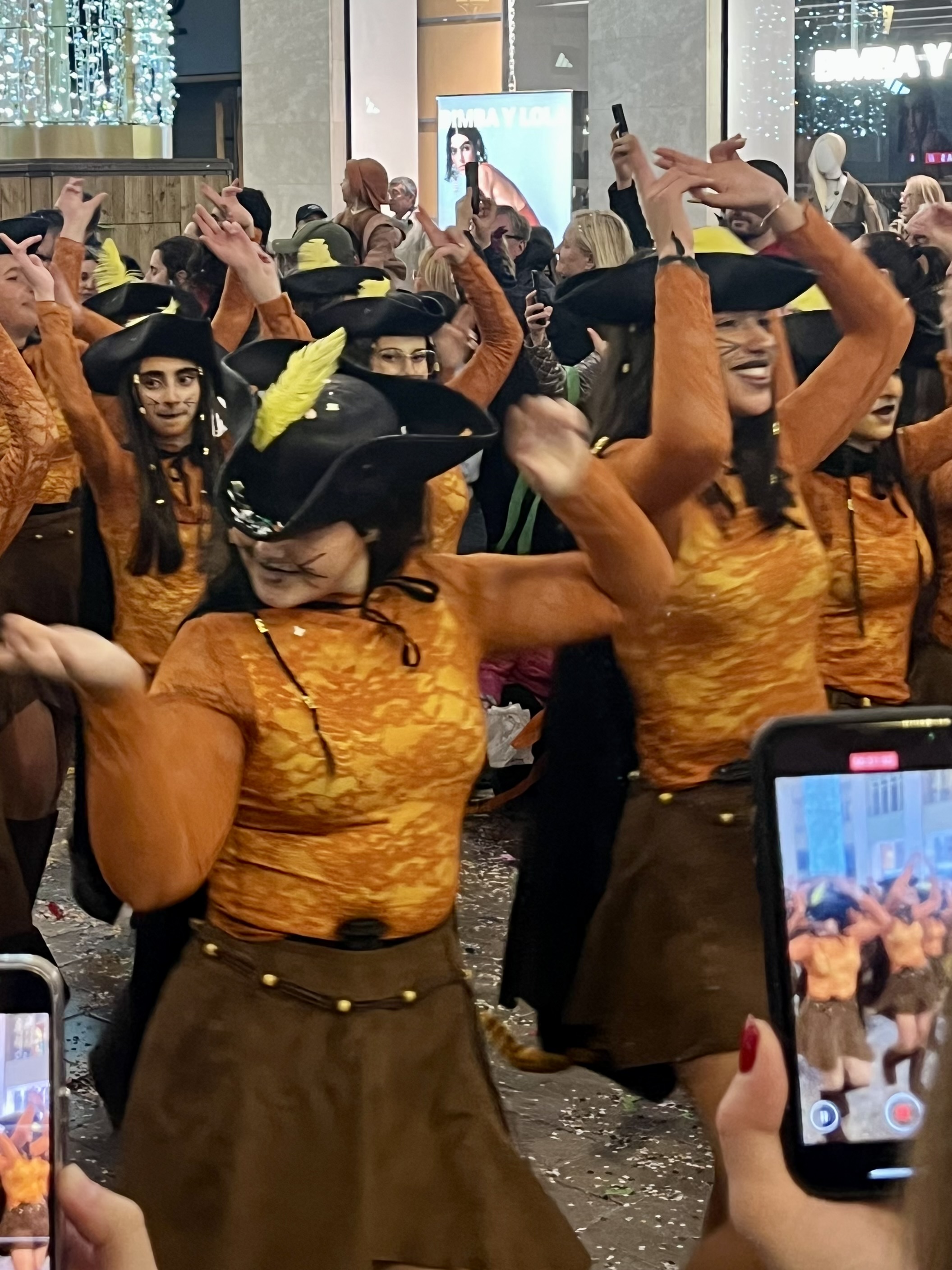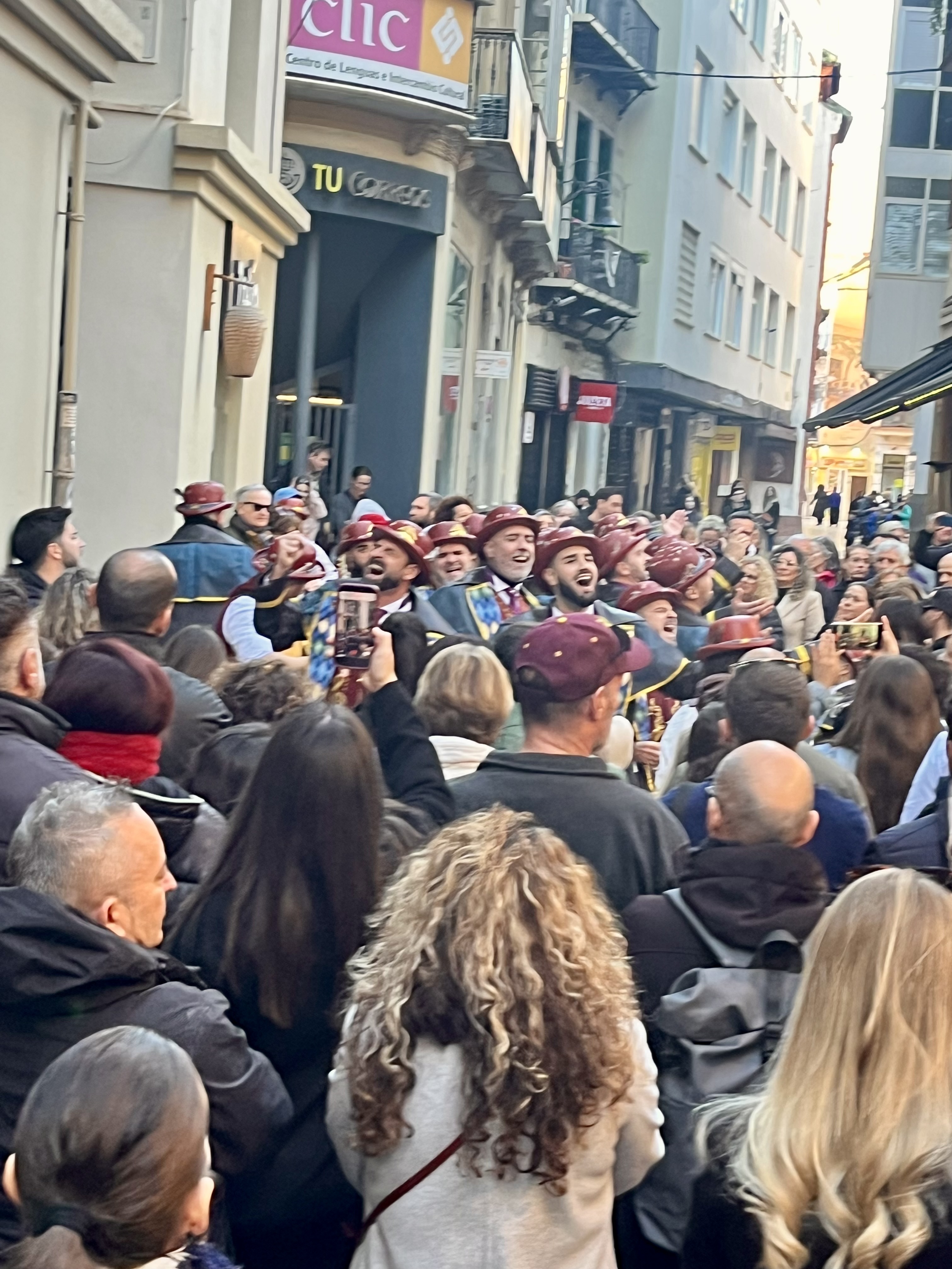 We happily joined another couple and headed into town. Some things are better with friends! Festivities were supposed to start at 1300. Being Spain, we purposely showed up well after that. I’d say the streets were decorated beautifully. The main drag boasted pillars lit up in twinkling lights with banners across the streets that reminded me of Mardi Gras decor. These banners had similar colors of gold, green and purple with a joker type character on each one.