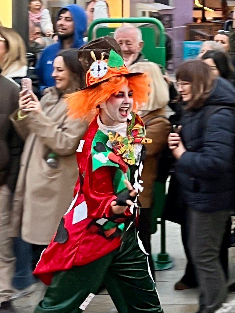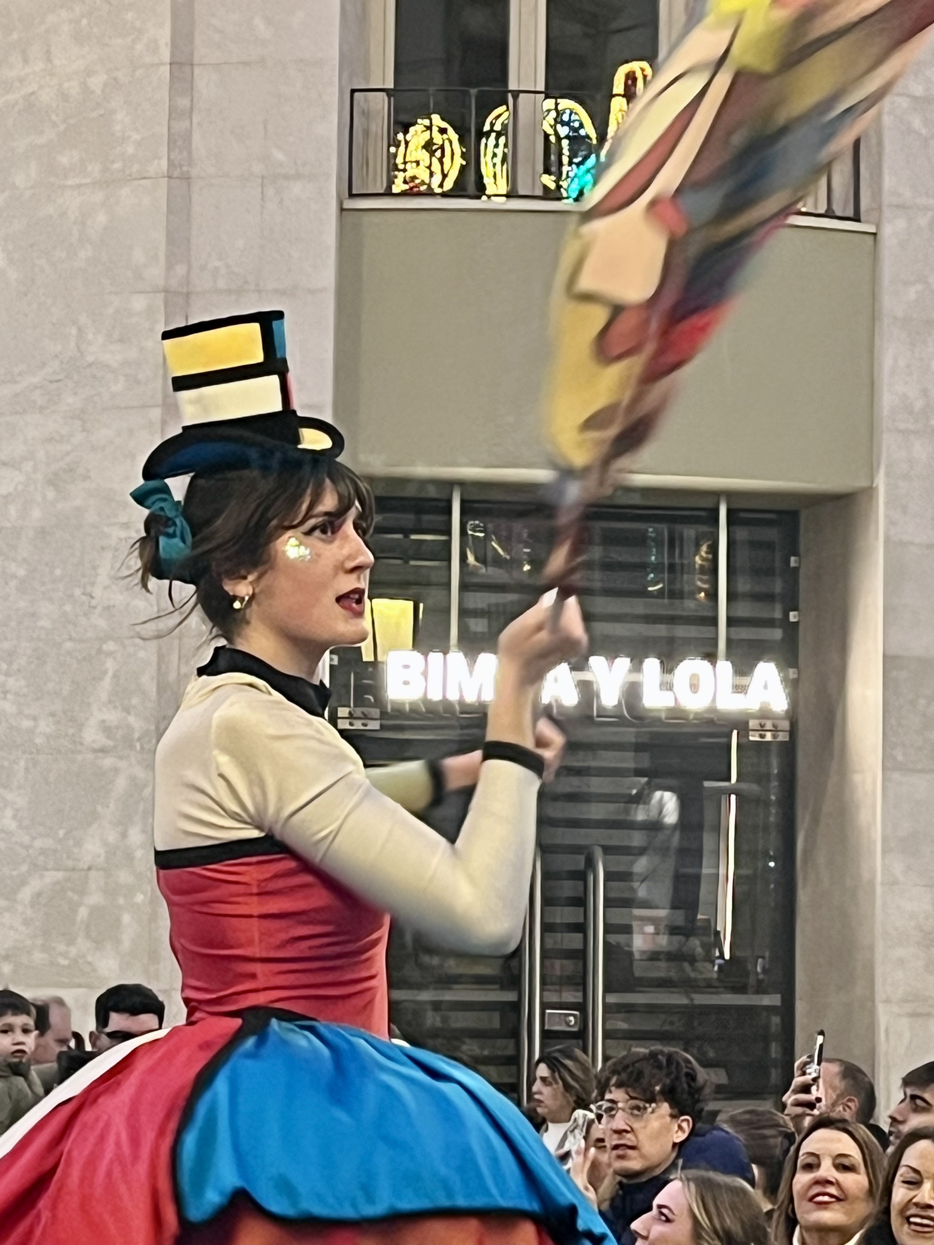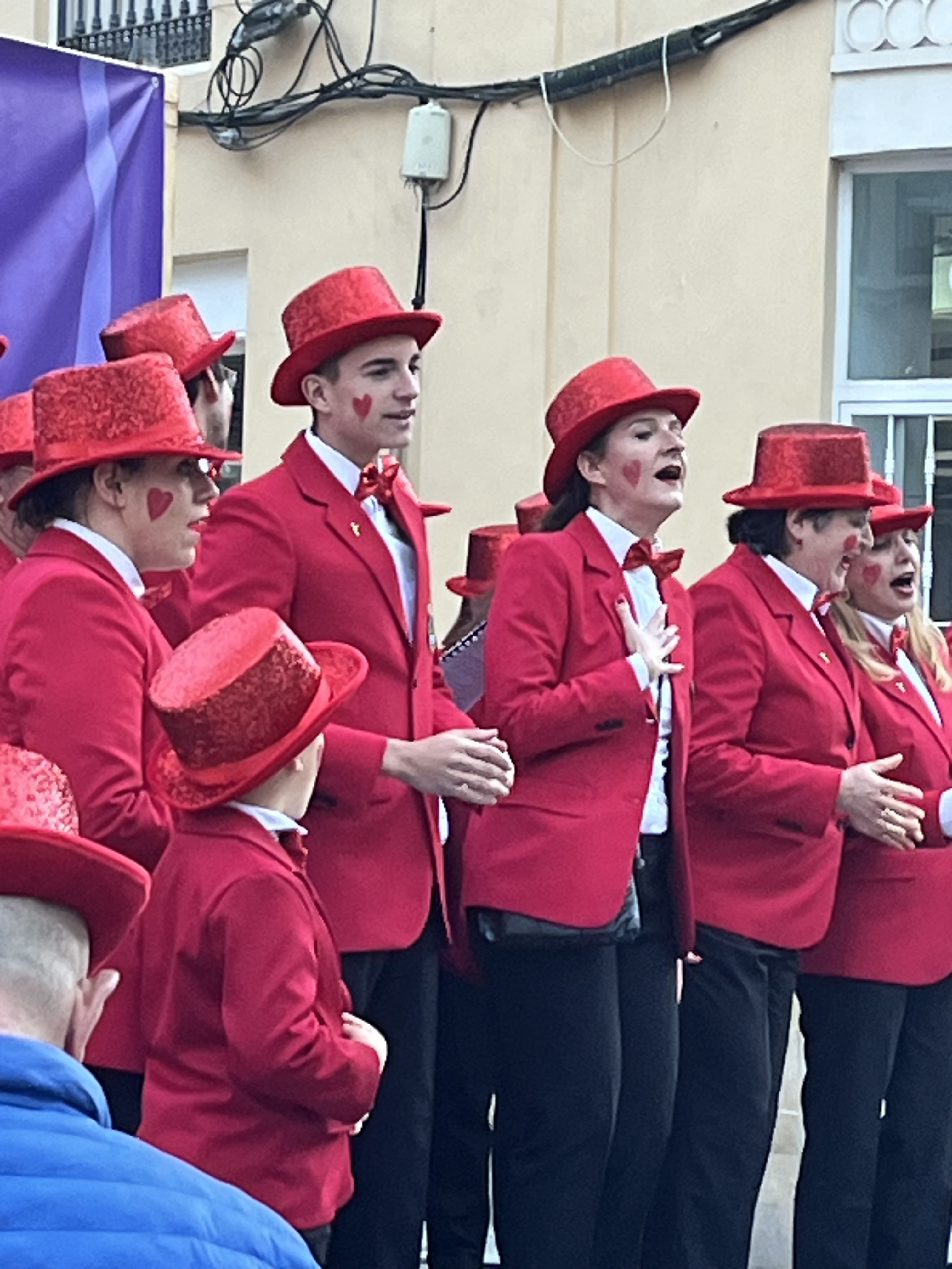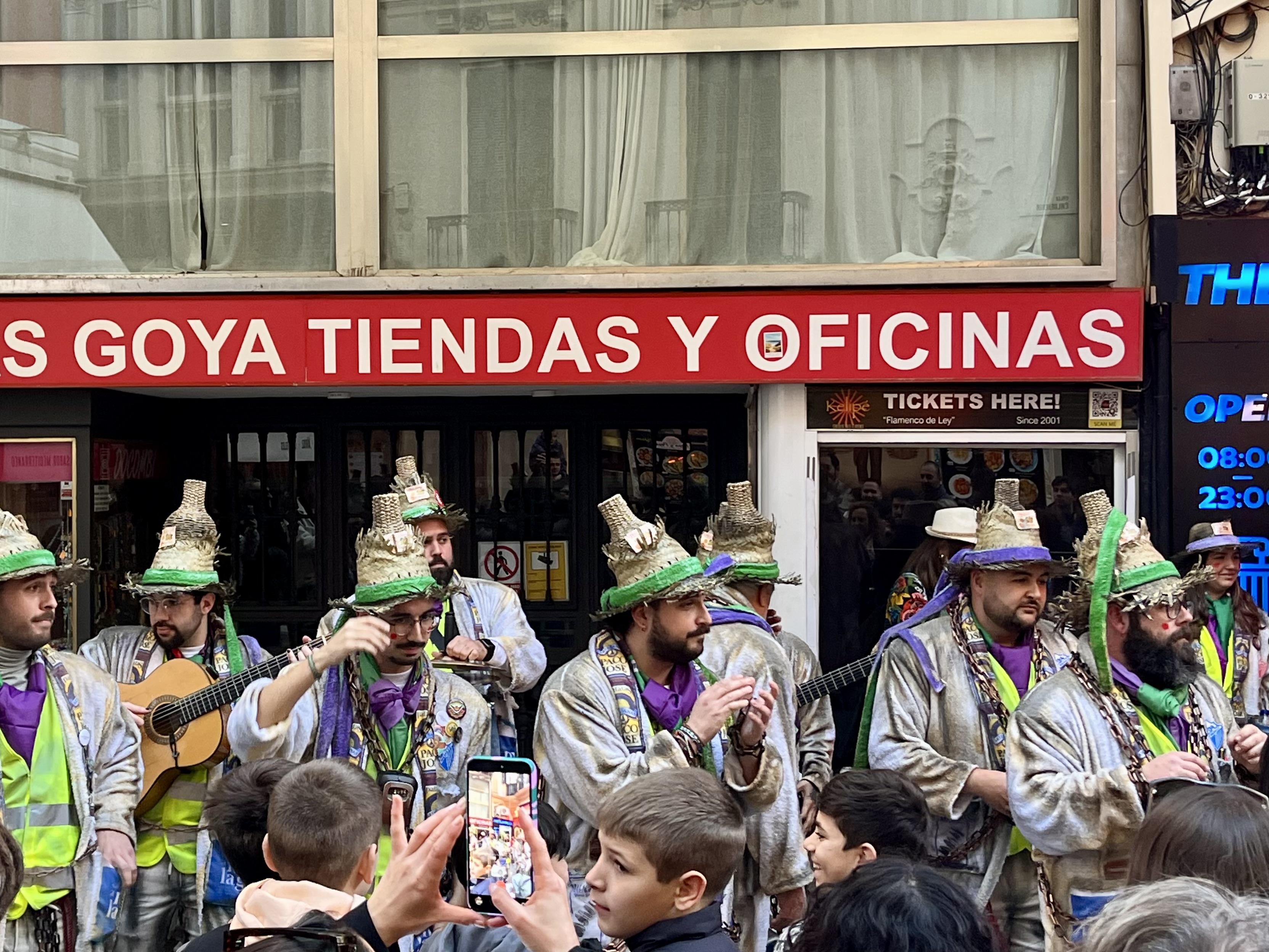 We happily joined another couple and headed into town. Some things are better with friends! Festivities were supposed to start at 1300. Being Spain, we purposely showed up well after that. I’d say the streets were decorated beautifully. The main drag boasted pillars lit up in twinkling lights with banners across the streets that reminded me of Mardi Gras decor. These banners had similar colors of gold, green and purple with a joker type character on each one.